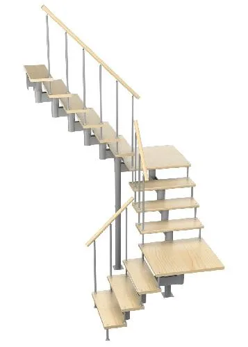 Удобная поворотная лестница на второй этаж. Дополнительные ограждения по первому маршу обеспечивают безопасность при подъеме и спуске, кроме того, небольшой угол подъема открывает всю площадь ступеней. Монтаж осуществляется силами двух человек на объекте по указаниям, приведенным в паспорте на лестницу.
