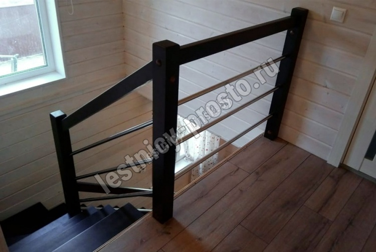 В комплекте: 3 прямых деревянных столба без какого-либо покрытия и профильный поручень без покрытия, комплект из 3 ригелей из стали (окрашены в цвет каркаса или хром по желанию) диаметром 12 мм. , необходимая фурнитура.