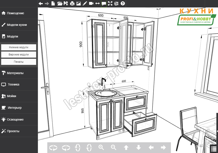 Благодаря модульной системе такая кухня может быть собрана зеркально, а, например, верхние шкафчики "под стекло" и "глухие" заменены местами. В стандартной комплектации нижние тумбы оснащены регулируемыми ножками высотой 100 мм и цоколем из массива сосны высотой 95 мм.
