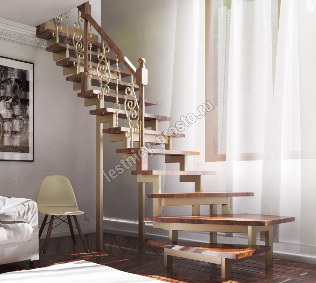 У данного варианта лестницы поворот реализован через забежные ступени. Под заказ возможно изготовление каркаса под поворотную площадку.