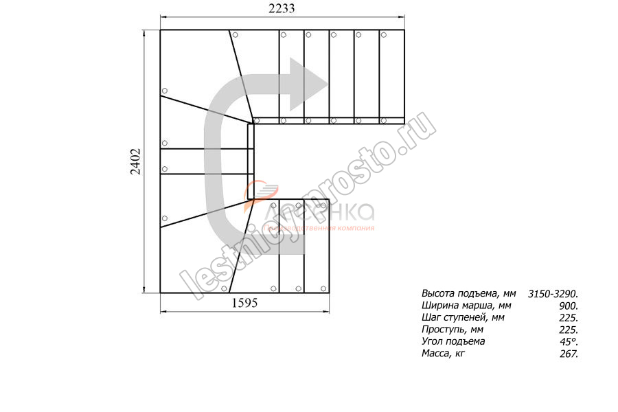 Модульная лестница Спринт 225 3150-3290, Серый, Лиственница, Крашеная